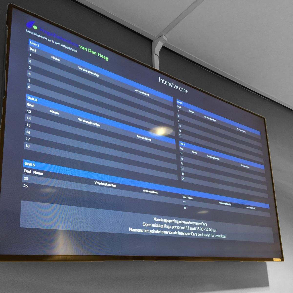 Informatieborden in het HagaZiekenhuis van Den Haag. Op deze borden wordt nuttige en actuele informatie voor de werknemers en bezoekers getoond, zoals de locatie van de patiënt, zijn of haar naam en de huidige verpleegkundige, arts-assistent en intensivist voor die patiënt. Deze borden kunnen vanaf elke werkplek worden geüpdatet. De borden zorgen voor efficiëntere en snellere zorg.
